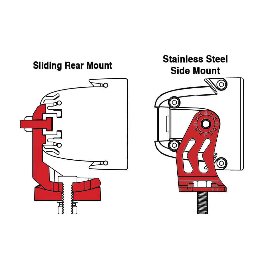 | Includes Dual Mounting System: Black 304 Stainless Steel Side Brackets, Black Powder Coated Sliding Rear Brackets and Stainless Steel Hardware | |