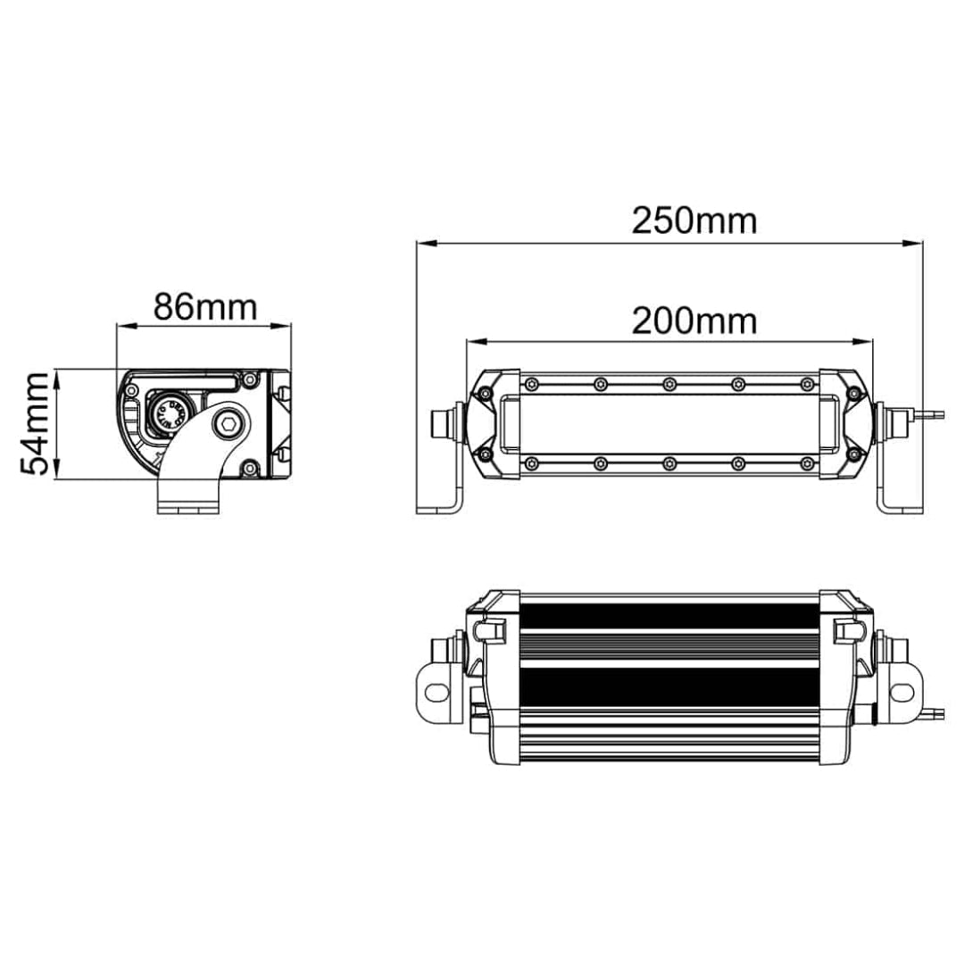 86mm D x 200mm L x 54mm H (2 x 6" Light Bars) |